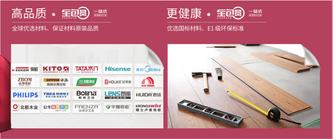 全包圆承诺高品质、更健康的装修。全球优选一线品牌材料,业主可享全包圆F2C模式全球化供应链体系直采,不仅品质100%有保障,而且无中间商赚差价,费用可立省30%。更重要的是,所选国标材料均达E1级环保标准,让家真正成为呵护健康的港湾,让夫妻的爱情结晶不再承受劣质建材侵蚀健康之痛。